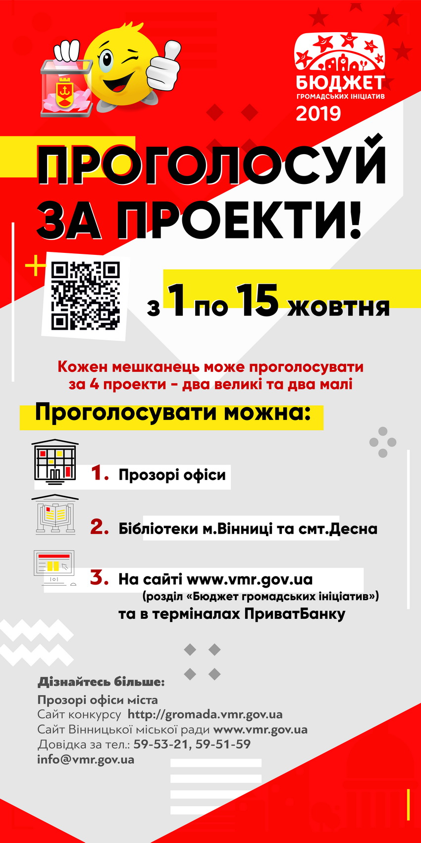 Кожен мешканець Вінницької міської ОТГ може проголосувати за 4 проекти: два великі та два малі. Загалом на голосування виноситься 36 проектів(28 - великих та 8 – малих), які подавали громадяни України з 1 квітня по 15 травня 2019 року. Проекти, які отримають найбільшу підтримку вінничан, будуть реалізовані виконавчими органами міської ради в 2020 році, на що в бюджеті буде заплановано 7 млн. грн.