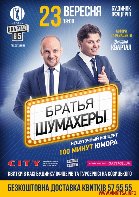 Авторы и резиденты «Вечернего Квартала» - «Братья Шумахеры» 23 сентября впервые приедут в Винницу с нешуточным концертом «100 минут юмора». Самая знаменитая кузница юмора Украины - «Студия Квартал 95» рекомендует, а значит - нет места сомнениям: 23 сентября в 19.00 в Доме офицеров будет столько юмора и смеха, что мало не покажется никому!