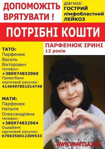 Мама дівчинки Наталя розповіла ВИННИЦА.info, що вперше Ірина захворіла ще в 2006 році, коли їй було всього 3,5 рочки. Тоді дитині поставили діагноз «гострий лімфобластний лейкоз». Під час лікування у Вінницькій дитячій обласній додався ще й гепатит С. Кілька років вінничани боролися з недугом і, здавалося все позаду. Проте, через довгий час у дитини стався рецидив - знову гепатит С і лейкоз з ураженням центральної нервової системи.