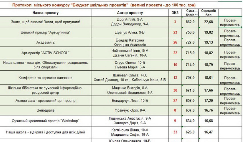 Фіналістами стали два малих проекти шкіл №1 та №7, а також одинадцять великих проектів, які представили школи №3, №23, №26, №22, №10, №13, №30, №27, №8.