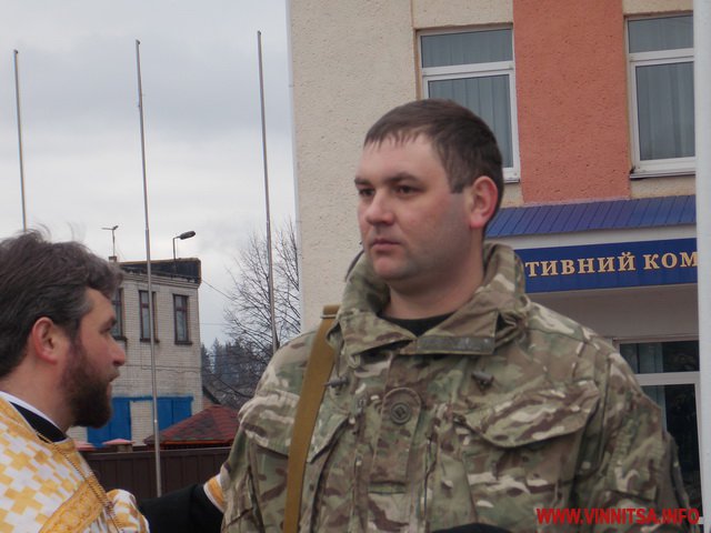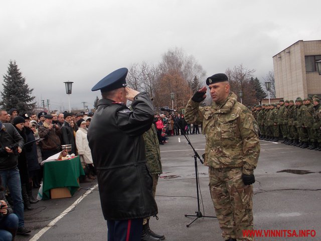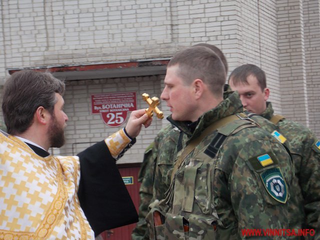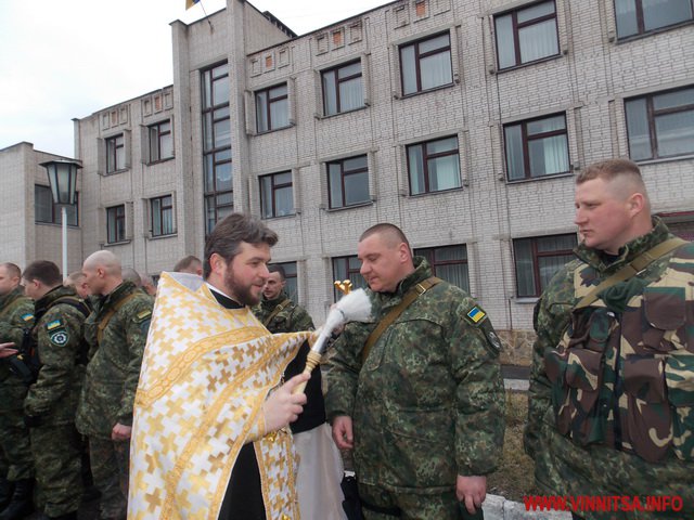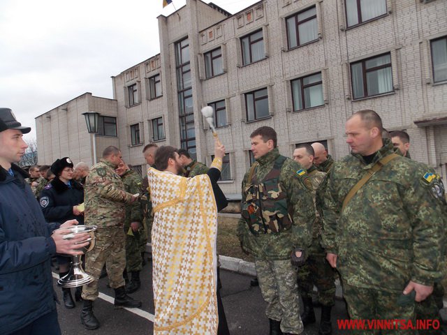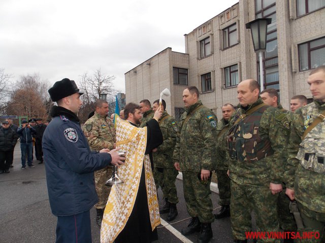 Вінницьких міліціонерів благословив на благородну справу захисту рідної країни настоятель храму Дмитра Солунського отець Сергій. Він окропив бійців святою водою та побажав повернення додому без втрат.
