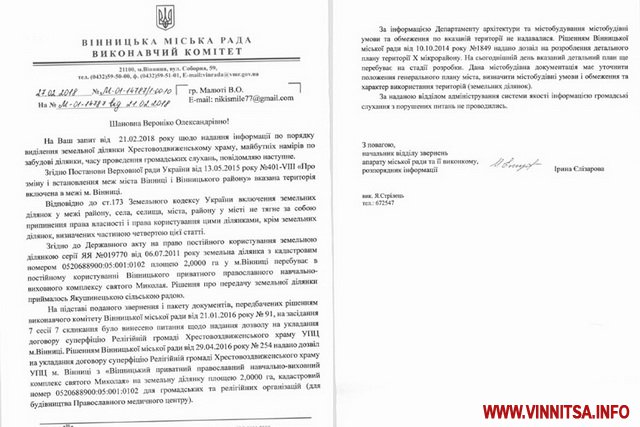 Журналіст Вiнниця.info надіслала офіційний запит до Виконавчого комітету Вінницької міськради. Там відповіли, що територія, на якій хочуть будувати церкву та інші приміщення, увійшла до меж обласного центру у 2015 році. До того вона належала Якушинецькій сільській раді. Саме цей орган місцевого самоврядування у 2011 році віддав 2 гектари в постійне користування Вінницького приватного православного навчально-виховного комплексу Святого Миколая. Громадських слухань не проводили.