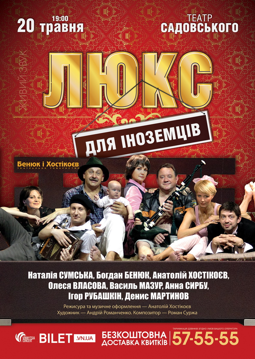 0 травня о 19.00 у Вінницькому театрі імені Садовського метри української сцени Богдан Бенюк, Наталія Сумська і Анатолій Хостікоєв презентують іскрометну комедію про курйози сімейного життя «Люкс для іноземців»!
