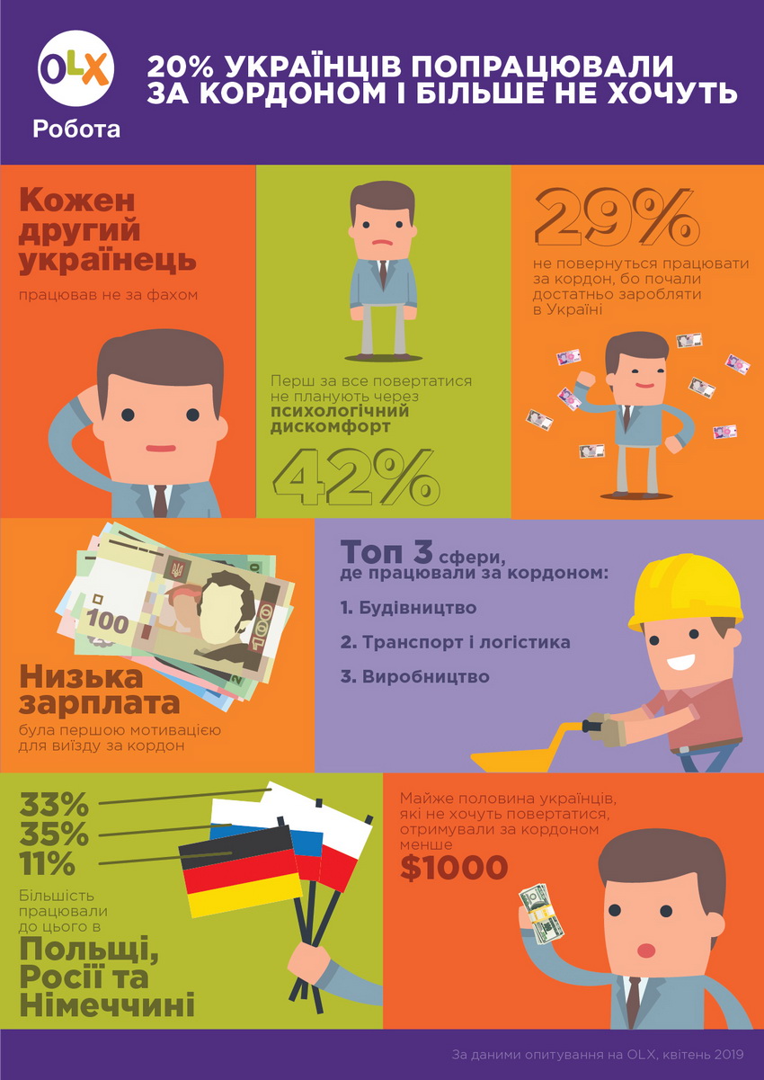 20% українців, які довгостроково працювали за кордоном, не планують їхати туди на заробітки знову - показали результати опитування на OLX Робота. Головною причиною став психологічний дискомфорт. Серед цієї категорії заробітчан більшість працювала до цього в Польщі, Росії та Німеччині. Майже половина отримувала менше $1000. А першою мотивацією до виїзду стала низька зарплата - 42% респондентів.