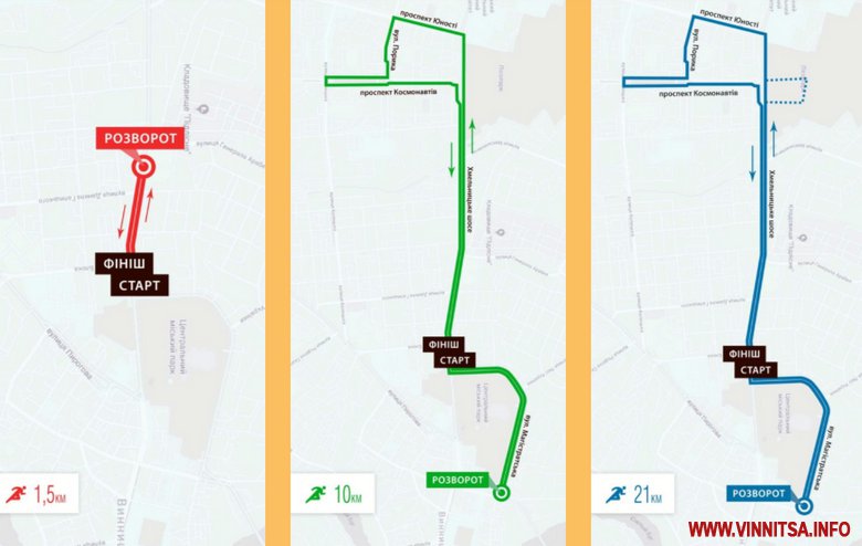 Початок забігу об 11:00. Старт і фініш відбудеться на площі Василя Стуса. Городяни можуть долучитися до бігу на 1,5, 10 і на 21 кілометри.