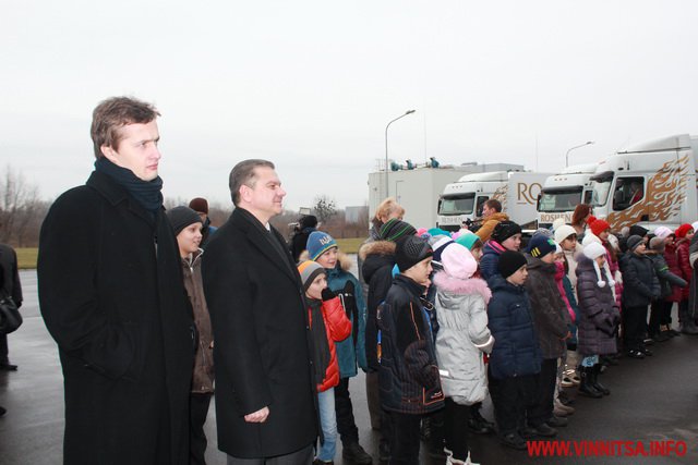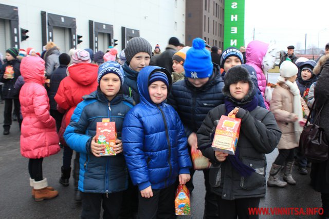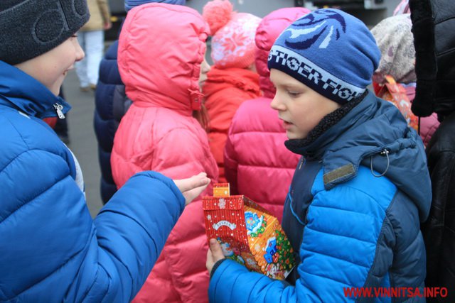 Перші фури із солодощами, які з помічниками Святого Миколая вже виїхали з кондитерської фабрики, проводжали разом з дітьми 30-ї школи, до інших маленьких адресатів в. о. міського голови Сергій Моргунов та народний депутат України Олексій Порошенко.