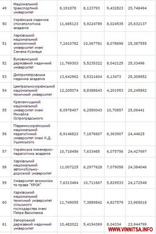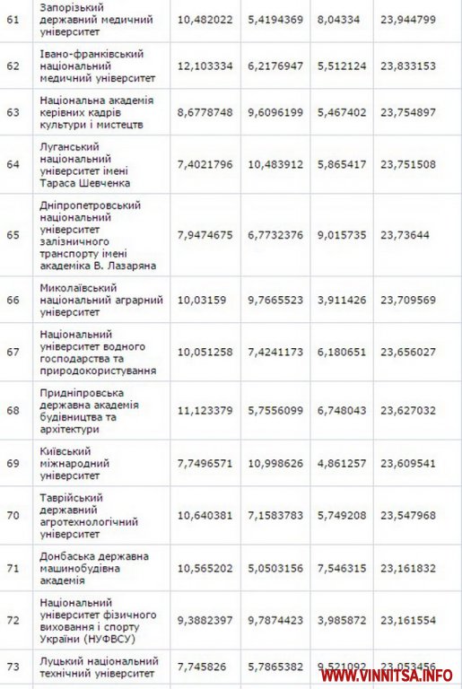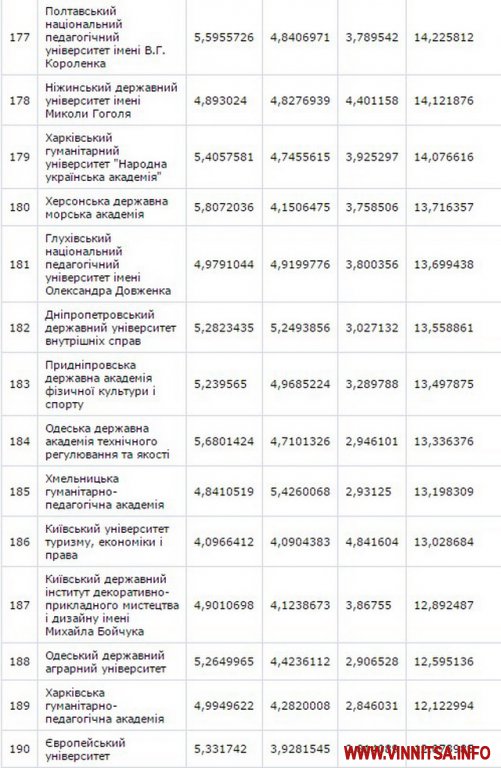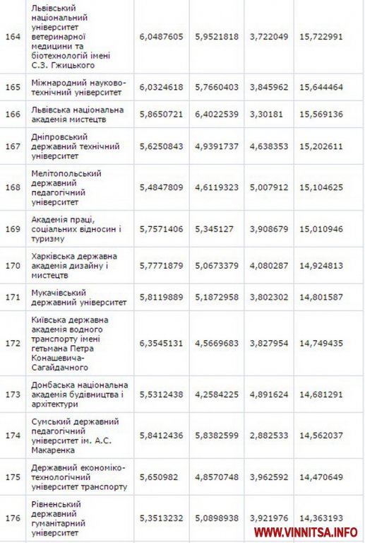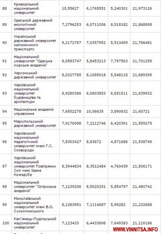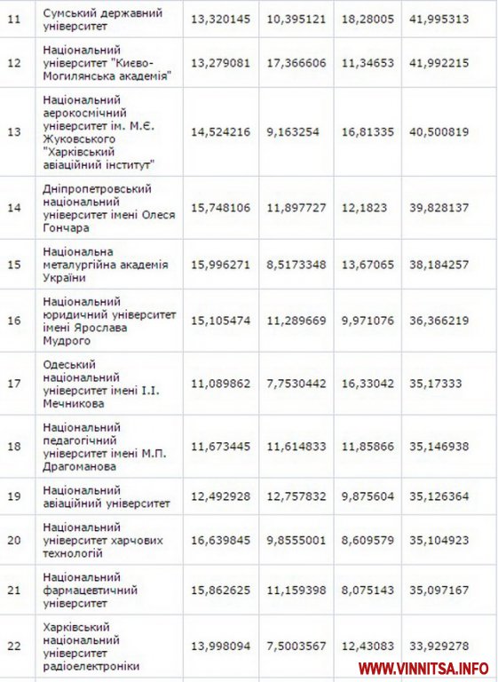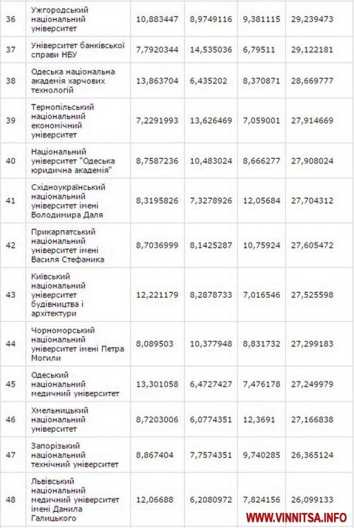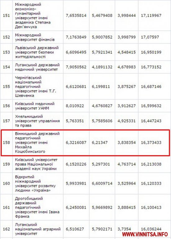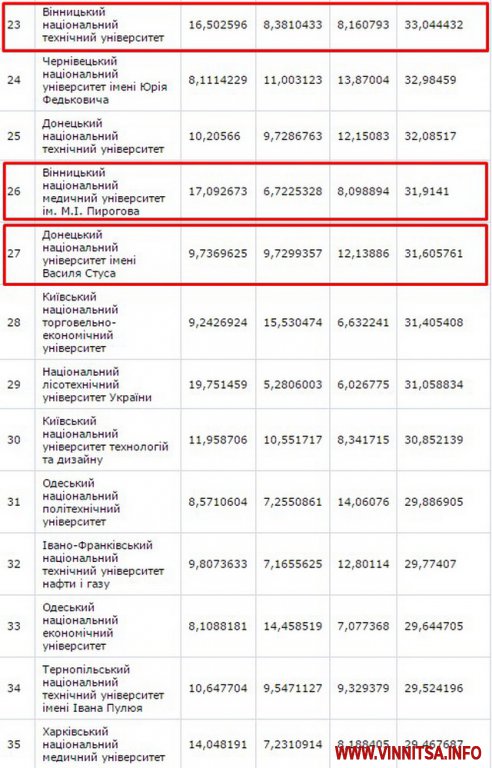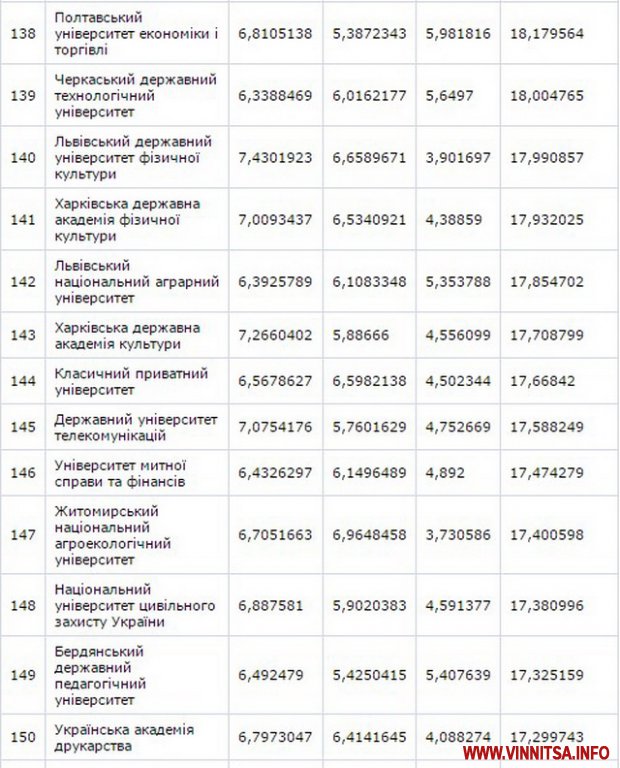 До другої сутні потрaпили Вінницький нaціонaльний aгрaрний університет – (129 місце) тa Вінницький держaвний педaгогічний університет імені М.Коцюбинського – (158 позиція).