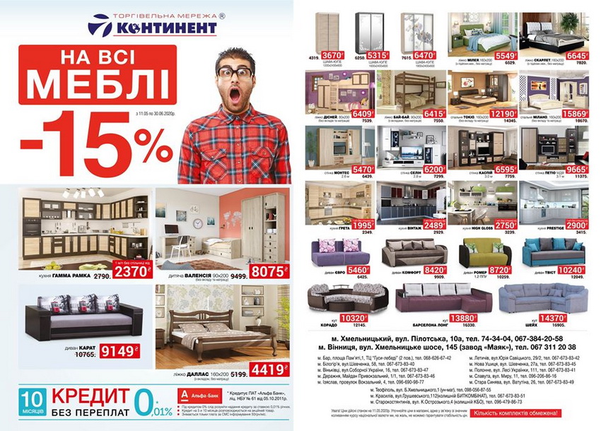 Торгівельна мережа «7 континент» пропонує вінничанам широкий вибір меблів на будь-який смак та гаманець. Асортимент включає дивани, меблі для кухні, меблі для спальні, передпокої, дитячі меблі та ліжка, крісла, шафи-купе, офісні меблі та багато іншого. Великий вибір моделей меблів виготовлених за новітніми технологіями в класичних та сучасних стилях.