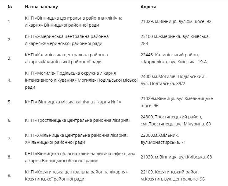 Перелік закладів охорони здоров’я Вінницької області першої хвилі