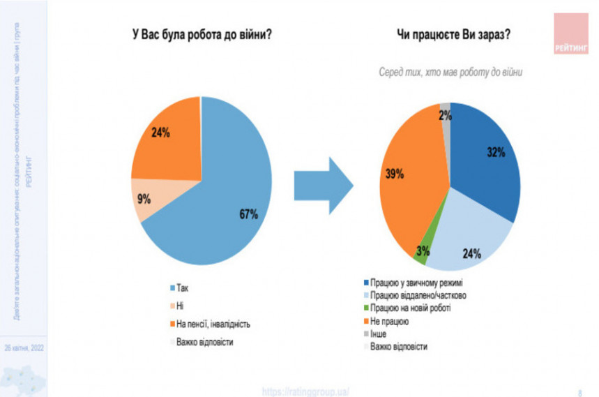 Водночас, 39% з тих, хто мав роботу до війни, досі не мають роботи (у березні було 53%, на початку квітня – 41%).