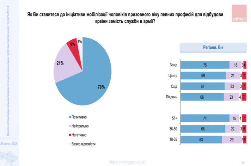 70% підтримують можливу мобілізації чоловіків призовного віку певних професій для відбудови країни замість служби в армії. Не підтримують – 6%. Частіше за таку ініціативу старші опитані, відносно менше підтримують – молодь.