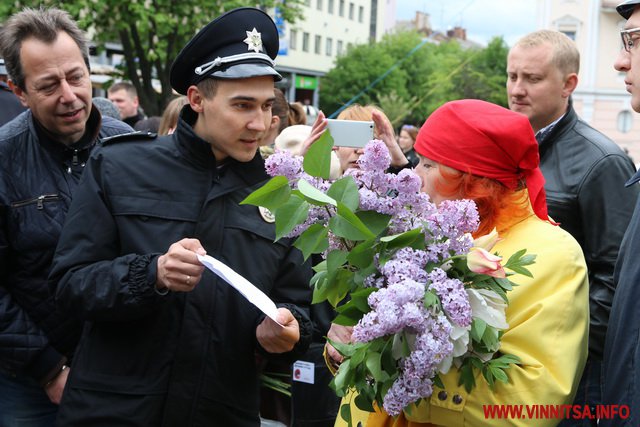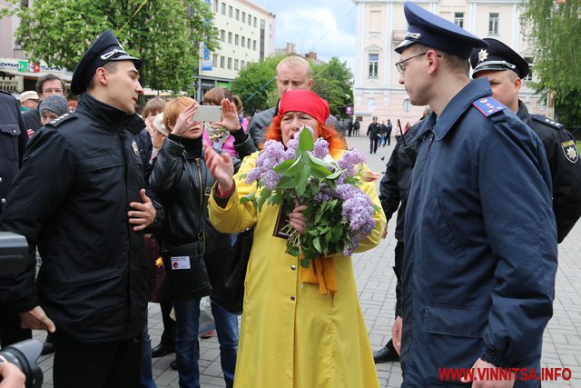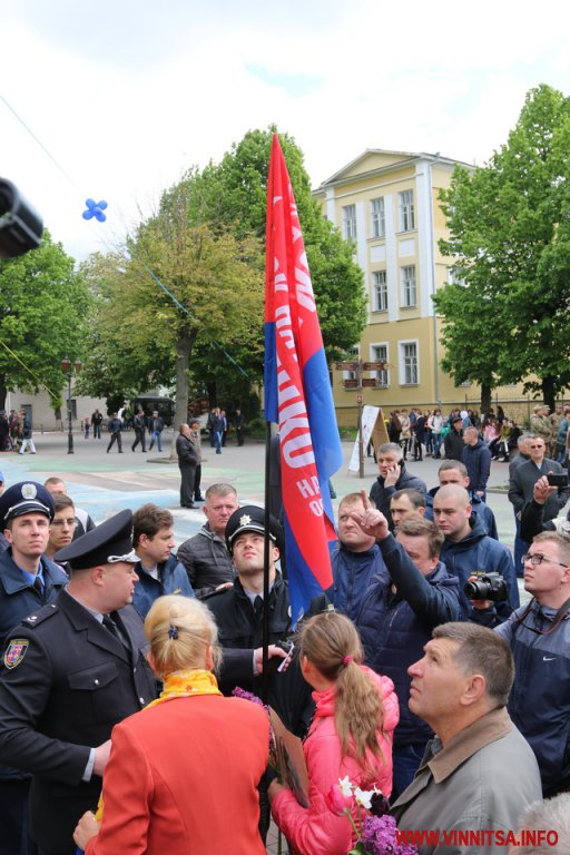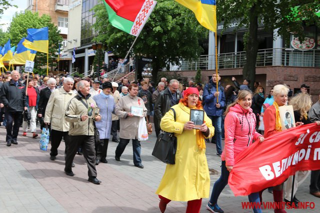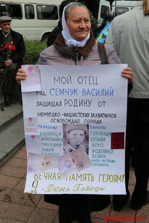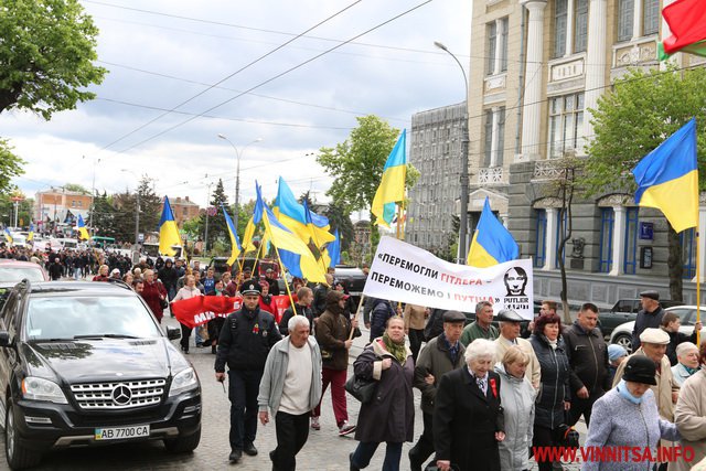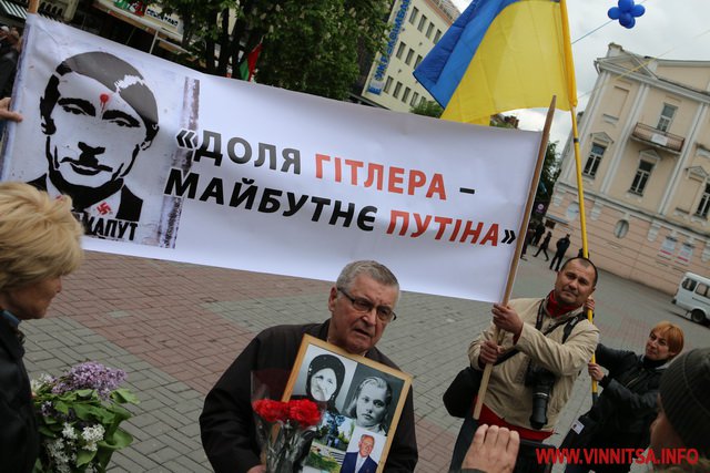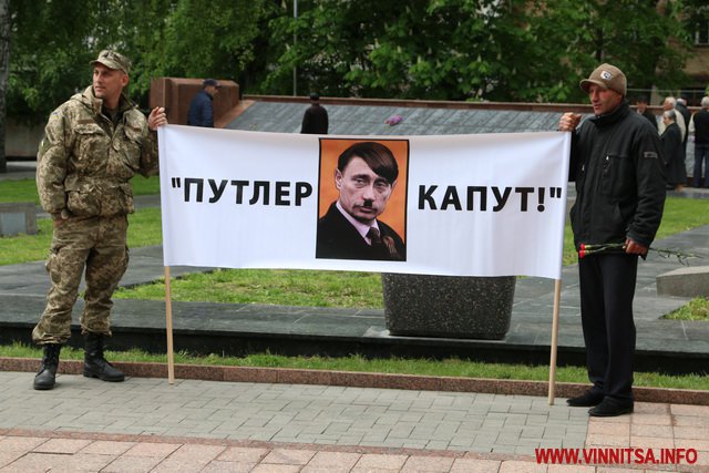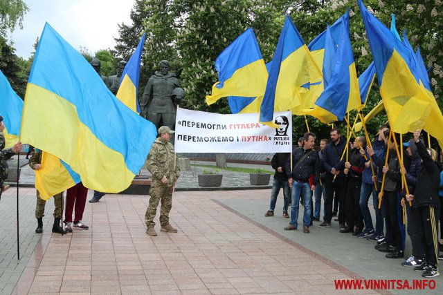 Варто зазначити, що День перемоги у Вінниці ознаменувався «антипутінівськими» лозунгами. Щоб не допустити прогнозованих провокацій з боку проросійських сил, місцеві журналісти розгорнули плакати з надписами: «Доля Гітлера – майбутнє Путіна», «Україна переможе», «Путлер – капут», підняли кількадесят державних стягів.