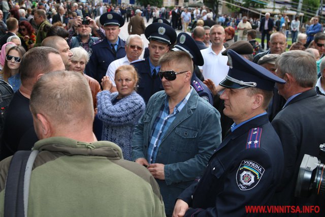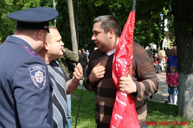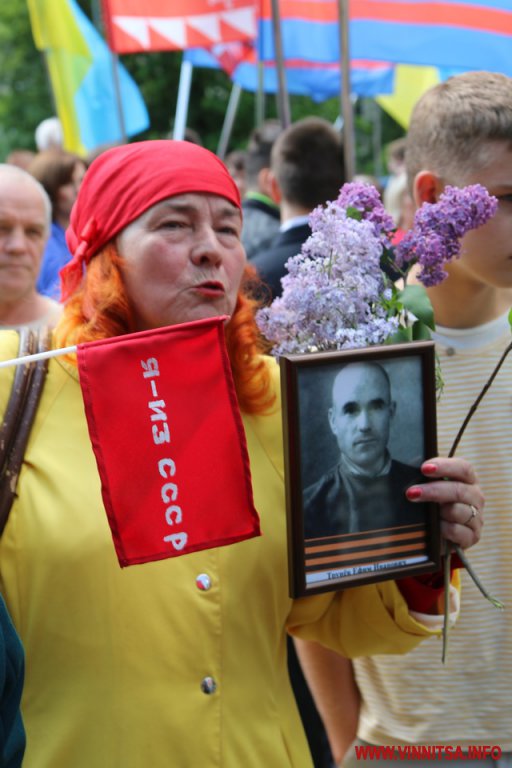 Близько 20 представників колишньої комуністичної партії Вінниччини принесли на мітинг-реквієм червоний прапор компартії, який заборонений «декомунізаційним пакетом» законів від 21 травня 2015 року. Кілька осіб тримали в руках «колорадські» стрічки.