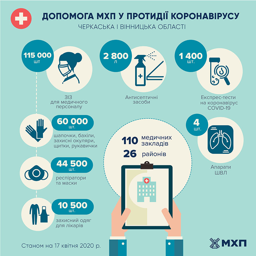 У межах своєї допомоги через платформи «Спільнодія Вінниччина: здолати COVID-19» та «Спільнодія Черкащини: здолати COVID-19» МХП вже спрямував до медичних закладів Вінницької та Черкаської областей: