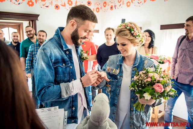 Розписалися молодята без пафосу. Замість весільних суконь та костюмів – джинсові куртки та лляні сорочки. Правда голову нареченої прикрашав вінок з мілких троянд, схожих на ті, які вона тримала у руках в весільному букеті.