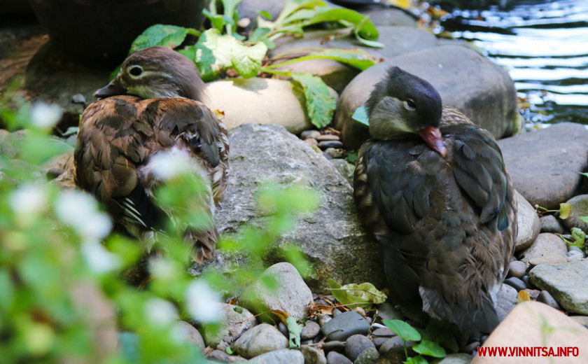Єнот розлігся на східцях до свого будиночку, а качки-мандаринки ховаються у холодку біля декоративного ставу, а лелека Ася тихо спостерігає за відвідувачами біля гойдалки.
