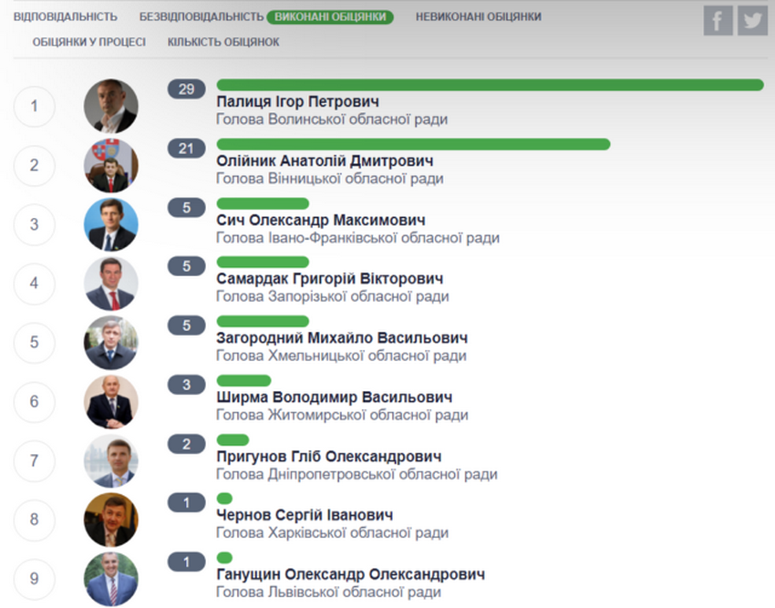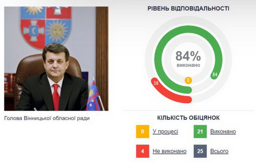 Друге місце він здобув, виходячи з абсолютної кількості виконаних обіцянок, – 21 з 25, і поступився за цим показником тільки голові Волинської облради Ігорю Палиці, – в того виконаних 29 із 38.