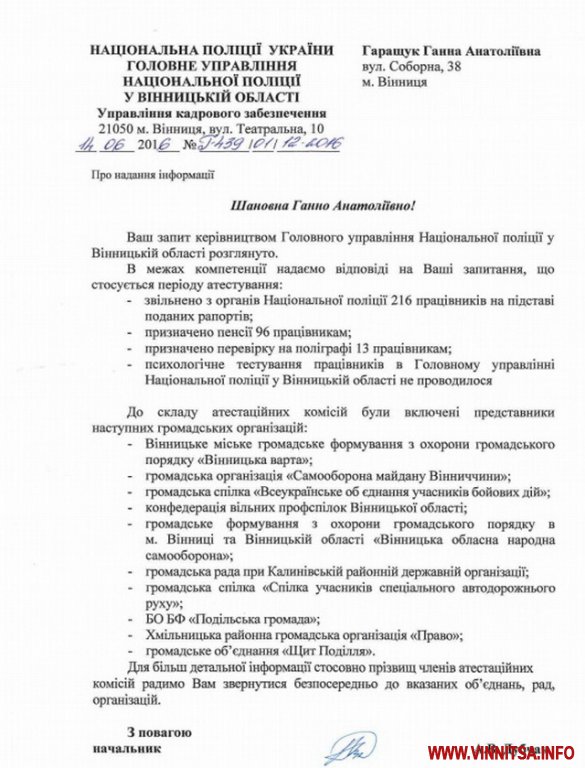 Щоб з’ясувати як на Вінниччині проходить атестація працівників Нацполіції області та які громадські організації врешті включені до складу атестаційних комісій, редакція Вінниця.інфо надіслала інформаційний запит у відомство.