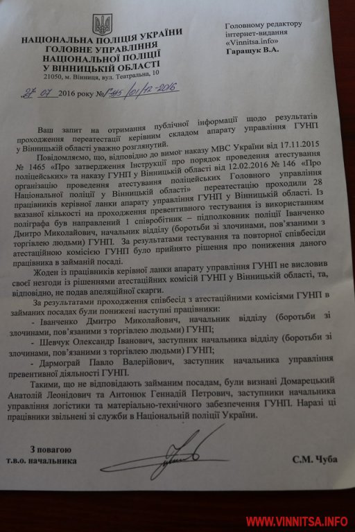 Такими, що не відповідають займаним посадам були визнані Домарецький Анатолій Леонідович та Антонюк Геннадій Петрович – заступники начальника управління логістики та матеріально-технічного забезпечення Головного управління Нацполіції Вінниччини. Наразі ці працівники звільнені зі служби в Національній поліції України», - зазначено у відповіді на запит.
