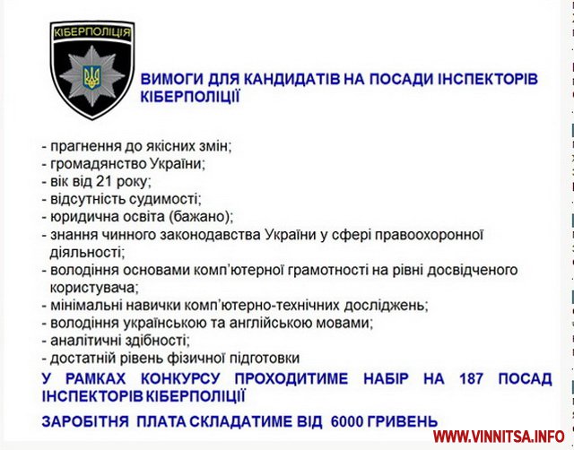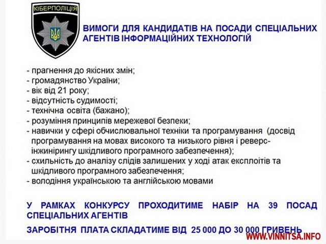 У Вінниці до департаменту кіберполіції планують набрати 5 інспекторів із заробітною платою від 6 тисяч гривень.