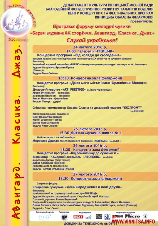 24 по 27 лютого у Вінниці відбудеться низка концертів та майстер-класів в рамках традиційного форуму молодої музики «Барви музики ХХ сторіччя. Авангард. Класика. Джаз».