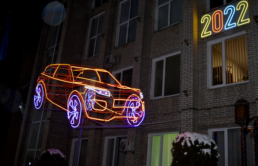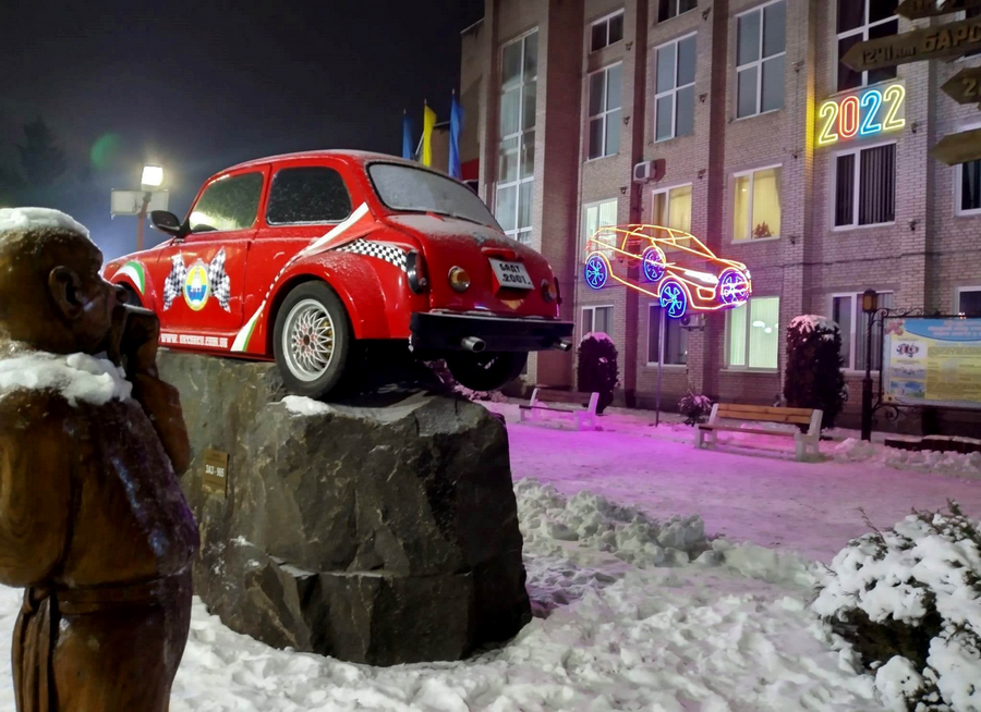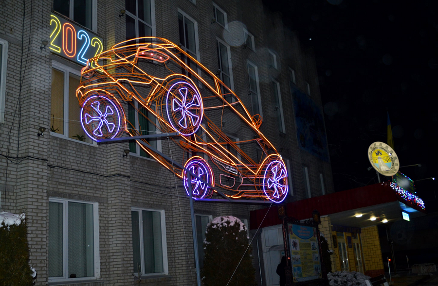 З 13 січня у місті Бар, що на Вінниччині, фасад місцевого коледжу прикрашає конструкція автомобіля. У вечірню пору вона спалахує яскравою ілюмінацією, якою оздобили корпус. Сконструювали та зробили конструкцію працівники «Барського фахового коледжу транспорту та будівництва НТУ». У виробничих цехах її монтували.