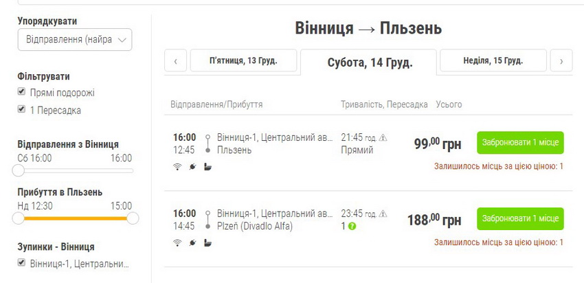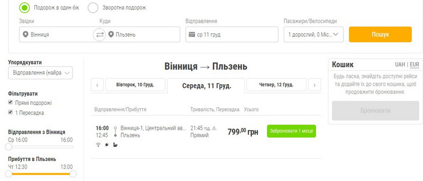 FlixBus – відомий в Європі автобусний лоукостер. Вартість квитків залежить від дня бронювання. Наприклад, якщо забронювати сьогодні на 11 грудня, то з Вінниці до Чехії проїзд коштуватиме 799 гривень, але на 14 грудня білети доступні від 99 гривень.