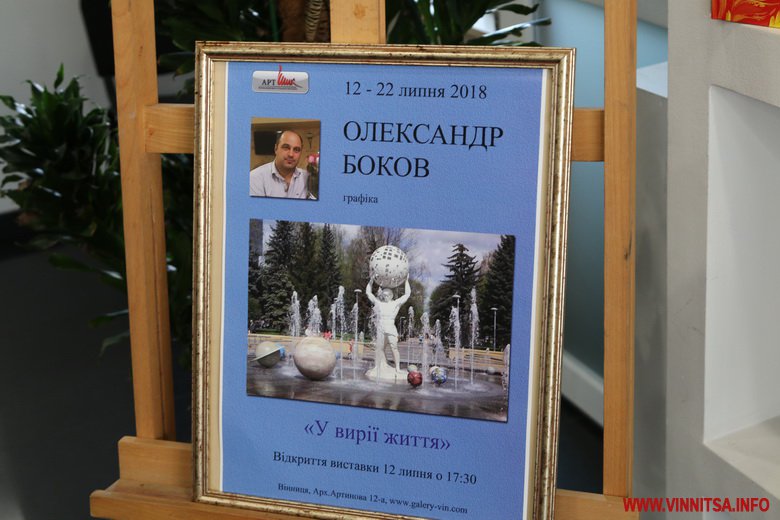 12 липня у Вінниці розпочала роботу персональна виставка робіт Олександра Бокова. Для митця – це перша експозиція власної графіки. Зазвичай свою творчість він втілює в бетоні. Містянам добре знайомі його роботи: це планети на фонтані по проспекту Космонавтів і водограй у Центральному парку, а ще фасади кількох ресторанів.