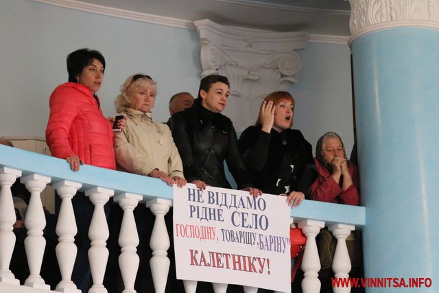 Прийшли до сесійної зали і представники ВНАУ та Агрономічної сільської ради. Люди, жителі села, вимагають вирішити земельне питання, в якому фігурує екс-регіонал Григорій Калетнік. Натомість студенти і викладачі ВНАУ переконують, що землі завжди були державними для освіти і науки. Вранці вони влаштували мітинг під стінами обласної ради. Громадяни просять депутатів дати їм слово першими,а не залишати на «Різне». Оскільки обранці понад годину не могли вирішитися з «абонплатою», активісти, не стерпівши, почали вигукувати «Дайте слово селянам» та «Ганьба».
