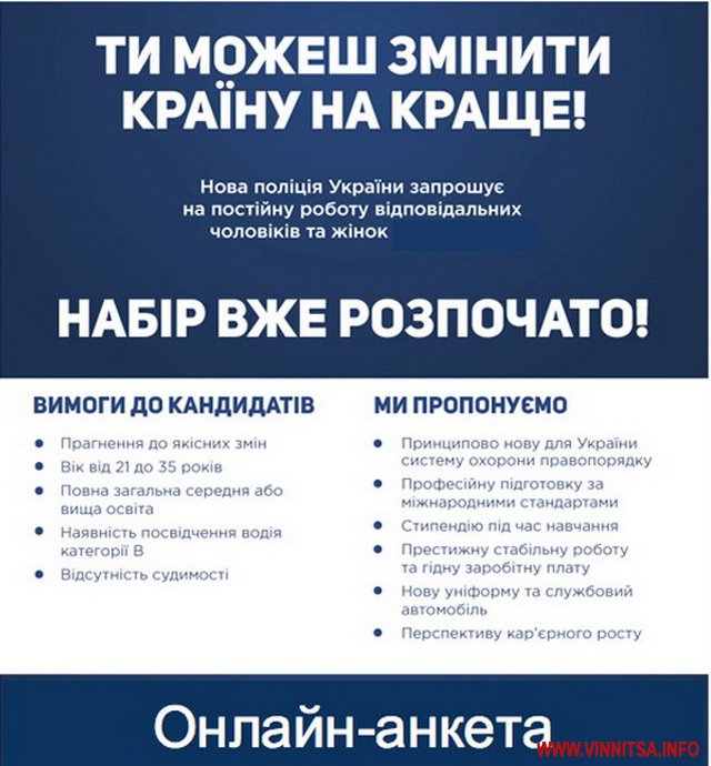 6 вересня стартує набір в нову патрульну поліцію Вінниці. Анкети прийматимуть з 6 до 28 вересня в «Плеяді».