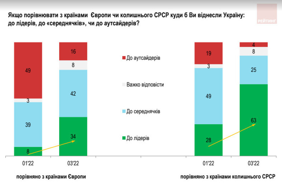 В період війни значно зросла самооцінка населення. Тепер Україну порівняно з країнами Європи бачать серед «лідерів» (34%) і «середнячків» (42%), тоді як ще два місяці тому бачили серед «аутсайдерів». Водночас, 63% бачать Україну в «лідерах» серед країн колишнього СРСР, тоді як ще два місяці тому бачили переважно серед «середнячків».