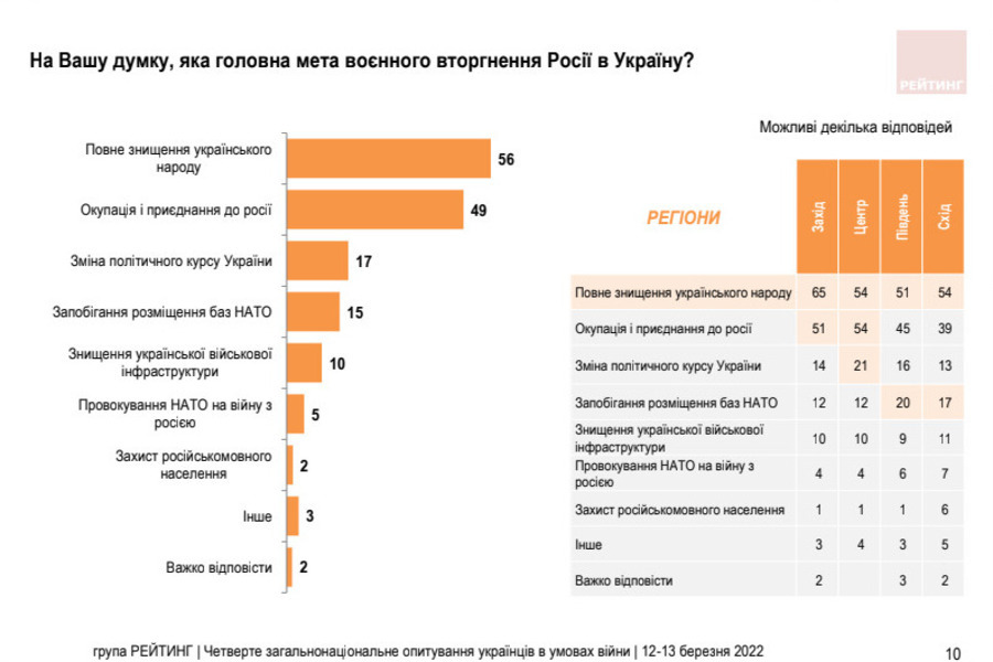 На думку 56% українців, головна мета вторгнення росії – це повне знищення українського народу, і вона домінує в усіх регіонах України. Ще половина вважають, що ціль нападу – окупація України і приєднання до росії. Тільки 15-17% думають, що росія переслідує мету змінити політичний курс України чи запобігти розміщенню баз НАТО, 10% – вважають, що мотивом є знищення військової інфраструктури, 5% – провокування НАТО на війну. Тих хто вважає, що вторгнення росії мало за мету захистити російськомовних – лише 2%.