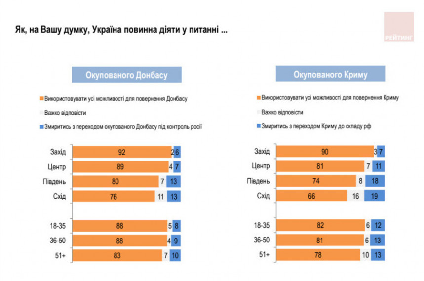 Однак, українці зовсім не готові віддавати ані Крим, ані Донбас: більшість вважають, що Україна має використовувати всі можливості для повернення окупованих територій Донбасу (86%) і Криму (80%). У цьому впевнені мешканці усіх регіонів, і цей показник зараз вищий, ніж у довоєнні часи.