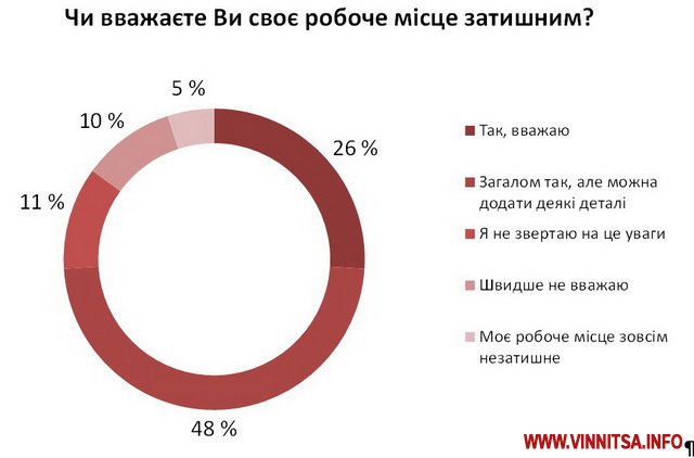 Офісні співробітники на роботі проводять у середньому по вісім годин щодня. Тому природно, що більшість із них мріють, щоб перебування в офісі було не тільки продуктивним, але й комфортним. 26% «білих комірців» вважають своє робоче місце затишним. Ще 48% хотіли би додати деякі дрібнички. 11% опитаних заявили, що ця тема їх взагалі не цікавить. Кожен десятий схиляється до того, що його робоче місце незатишне. А кожен двадцятий із впевненістю каже про некомфортне перебування на робочому місці.