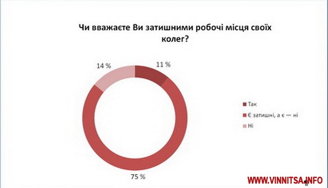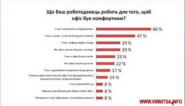 Комфортність офісного приміщення залежить від розміру фінансування і уваги, яку керівники приділяють темі затишку в офісі. Більшість офісних працівників (66%) працюють у кондиційованих приміщеннях. А ось спеціально обладнана кухня є навіть не в кожному другому офісі. В 29% компаній встановлені інформаційні стенди, а стіни прикрашені плакатами і постерами. 23% роботодавців не шкодують грошей на озеленення приміщень. Ще 22% офісів виставляють на всезагальний огляд підтвердження досягнень співробітників і компанії загалом: на стінах цих офісів можна побачити грамоти. Тільки 17% роботодавців облаштовують зону відпочинку для співробітників у вигляді диванчиків. Ще 14% прагнуть зробити функціональним кожен закуток офісу. Значно менша кількість офісних співробітників можуть похизуватися наявністю яскравого посуду, обладнаною кімнатою відпочинку з настільними іграми і дизайнерським оформленням офісного приміщення. Кожен із цих пунктів набрав по 8% голосів.