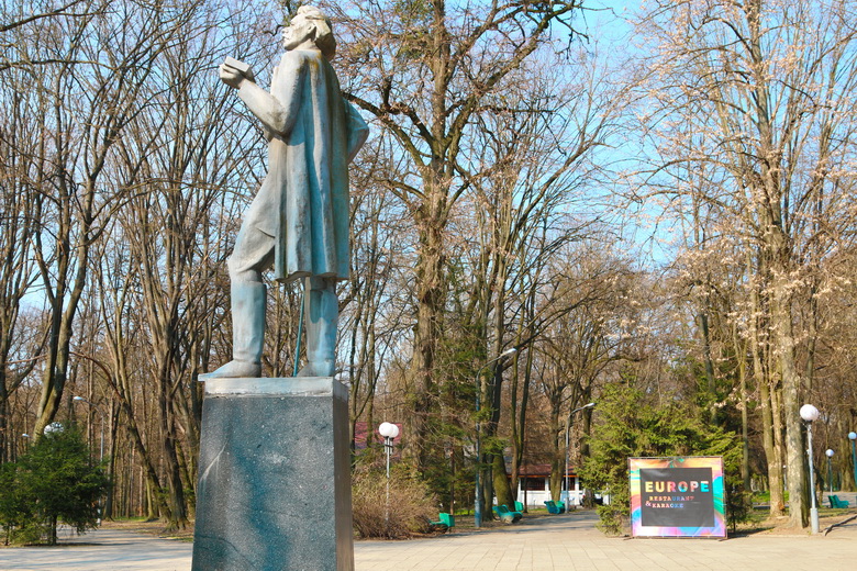 Біля центрального входу тривають ремонтні роботи, а на алеї кілька десятиліть стоїть Горький, на фоні якого реклама «Європи»).