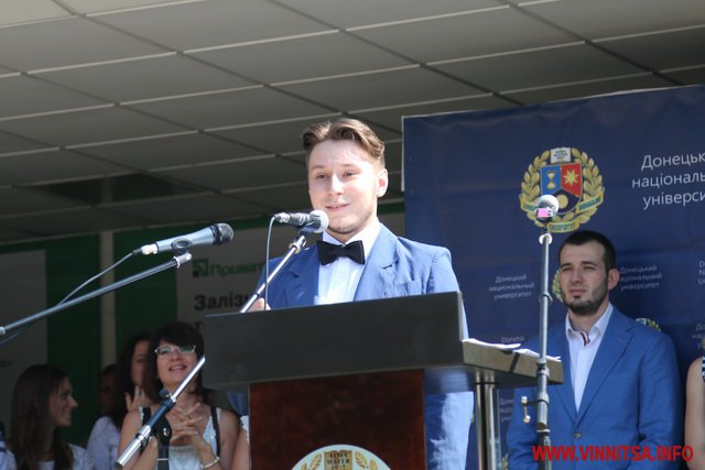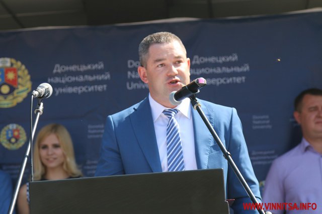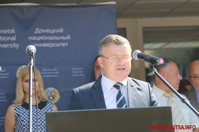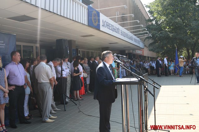 «Пройшов майже рік як Донецький національний університет, за трагічних обставин був змушений покинути свою малу Батьківщину. Було не просто, але ми зробили цей відповідальний крок і стали на захист державності і професійної гідності освітян та науковців України, попри всі негаразди і виклики долі ми вистояли і сьогодні разом з вами у гостинній Вінниці відкриваємо нову сторінку нашої історії. Шановні першокурсники кожен із вас пройшов довгий і складний шлях для того, щоб стати частиною нашої великою університетської родини. Щиро вдячний вам за довіру і підтримку нашої Альма-матер. Ми щодня будемо докладати максимум зусиль, щоб передати накопичений досвід та уміння, та надати вам можливість здобути сучасну освіту європейського рівня», - сказав ректор.