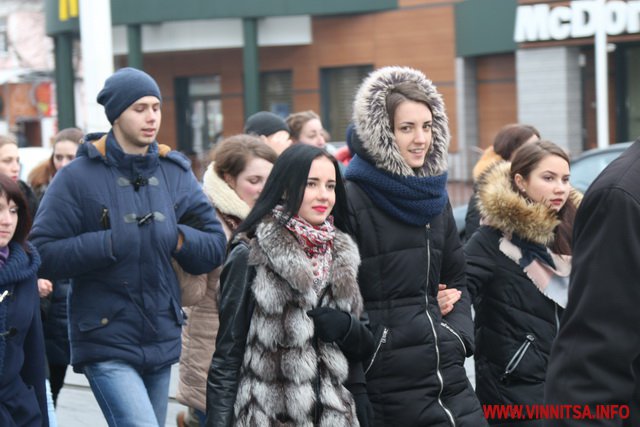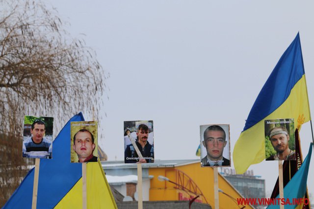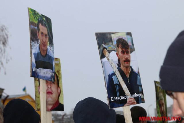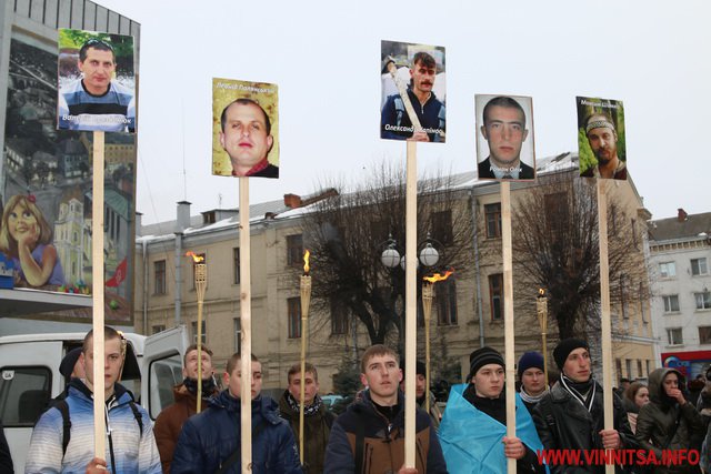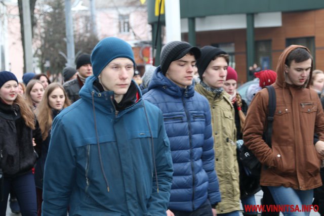 Студенти тримали в руках портрети Героїв Небесної Сотні з Вінниччини, які загинули на Майдані: Валерія Брезденюка, Леоніда Полянського, Олександра Капіноса, Максима Шимка, Романа Оліха та Юрія Нечипоренко.