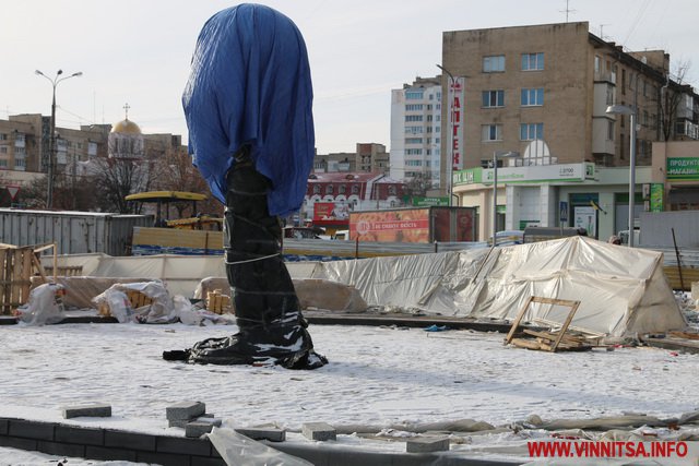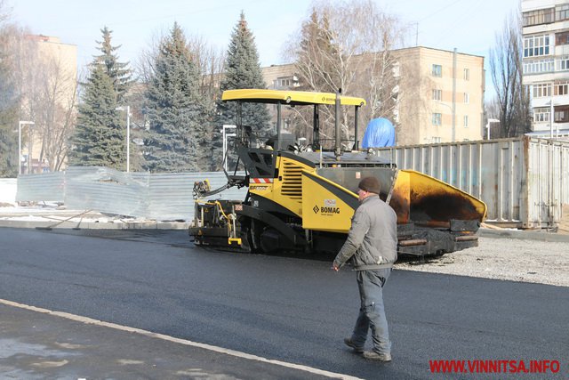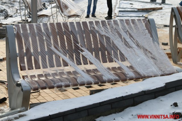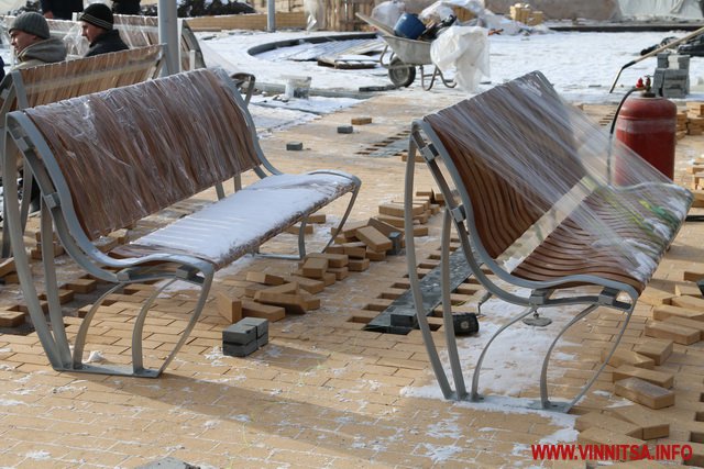 Не зупиняють роботу і в мороз. Біля нового фонтану продовжують стелити плитку. Вже поставили перші дві лавочки – зі спинками. Територія спорудження водограю досі обнесена парканом, але роботи тривають і за ним. Сьогодні тут завершили асфальтувати проїжджу частину зі сторони «прозорого офісу».