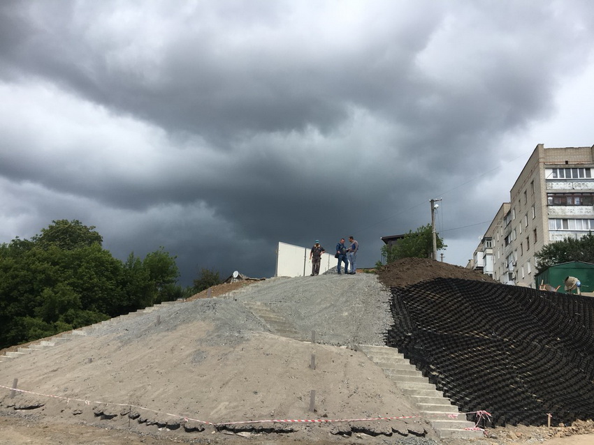 Оскільки зона відпочинку на схилі, його укріпили, додатково завізши землю, зробили сходи. Зараз облаштовують схил георешіткою, яка допоможе утримувати ґрунт.