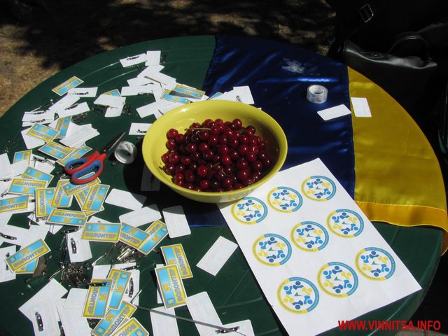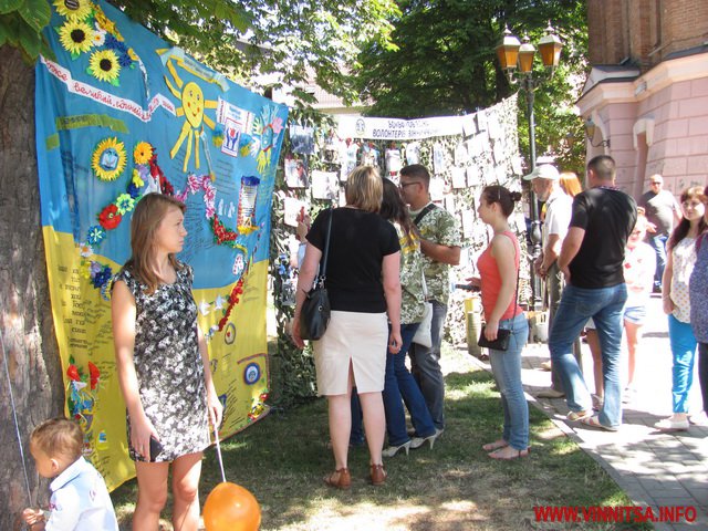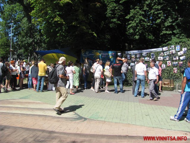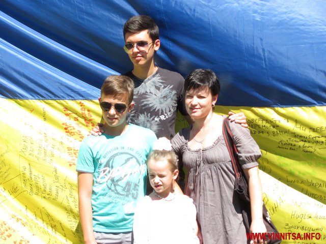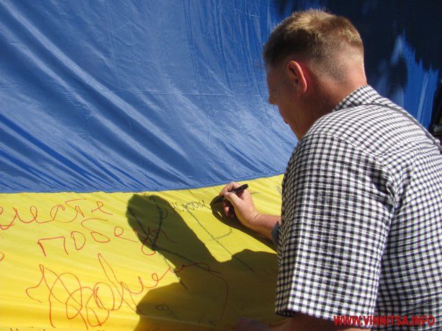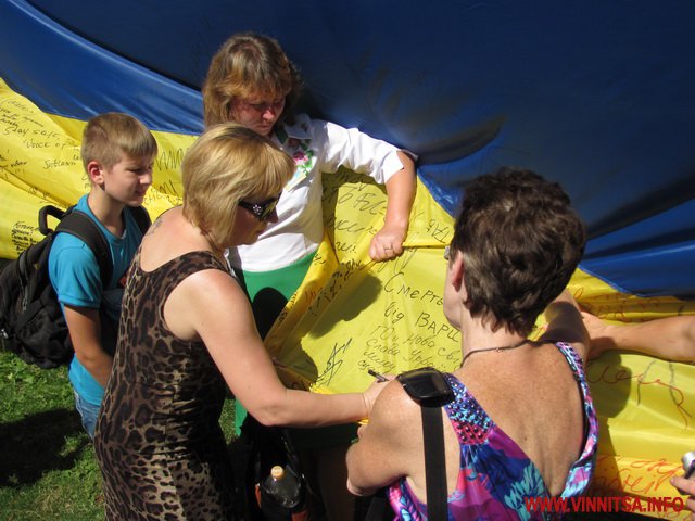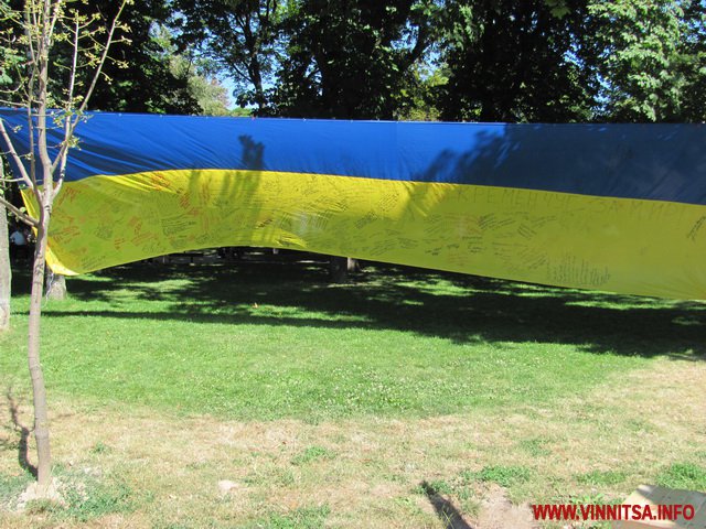 5 липня у Вінниця на Європейській площі розгорнули гігантський прапор. Жовто-блакитний стяг розміром 10 на 3 метри подорожує всією Україною. На Поділля він потрапив з Конотопу, організатори мріють завести патріотичне полотно і в Крим.