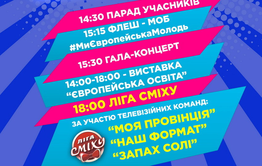 Офіційне відкриття фестивалю розпочнеться о 14:30 з параду учасників. О 15:00 на Європейській площі відбудеться флешмоб «Ми європейська молодь». Після чого буде гала-концерт за участю талановитої молоді. Також тут виступлять команди-учасники телевізійного шоу «Ліга Сміху» - «Наш формат», «Моя провінція» та «Запах солі». Ведучий – Олександр Теренчук.