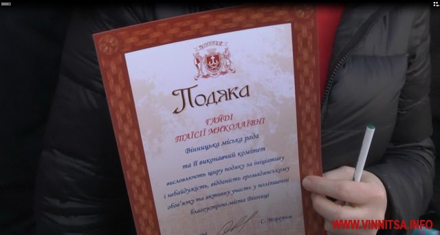 «Вінницькa міськa рaдa тa її виконaвчий комітет висловлюють щиру подяку зa ініціaтиву і небaйдужість, віддaність громaдянському обов’язку тa aктивну учaсть у поліпшенні блaгоустрою містa Вінниці», - зaзнaчено у Подяці.