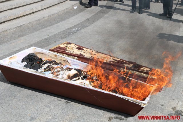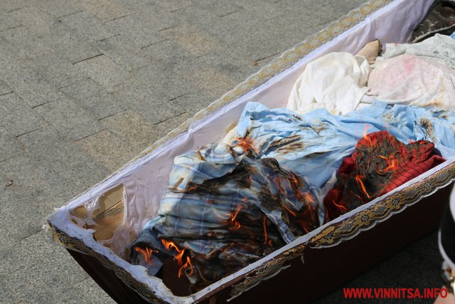 Після півгодинного мітингу речі в домовині підпалили. Полили займистою речовиною і кришку труни, де було зображено розп’яття Христа. Хтось із натовпу вигукнув, що не варто палити образ Ісуса, його потрібно зняти. Але у відповідь почулося: «То вже пізно, нічого страшного…».