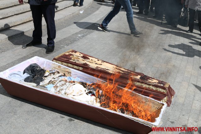 Спочатку домовину поставили перед міською радою, згодом – перенесли під стіни обласної. Там мітингувальники звинувачували очільників регіону у «всіх гріхах»: високих тарифах, геноциді новою медичною реформою, свавіллі поліції і незаконному обранні суддів.