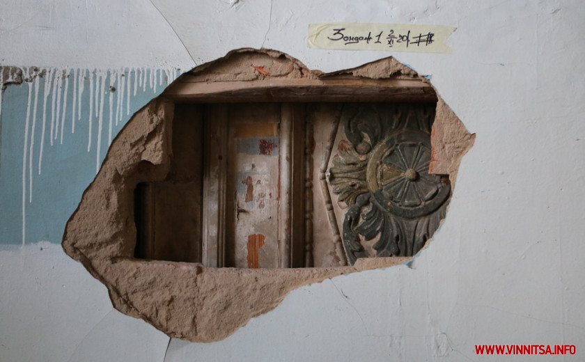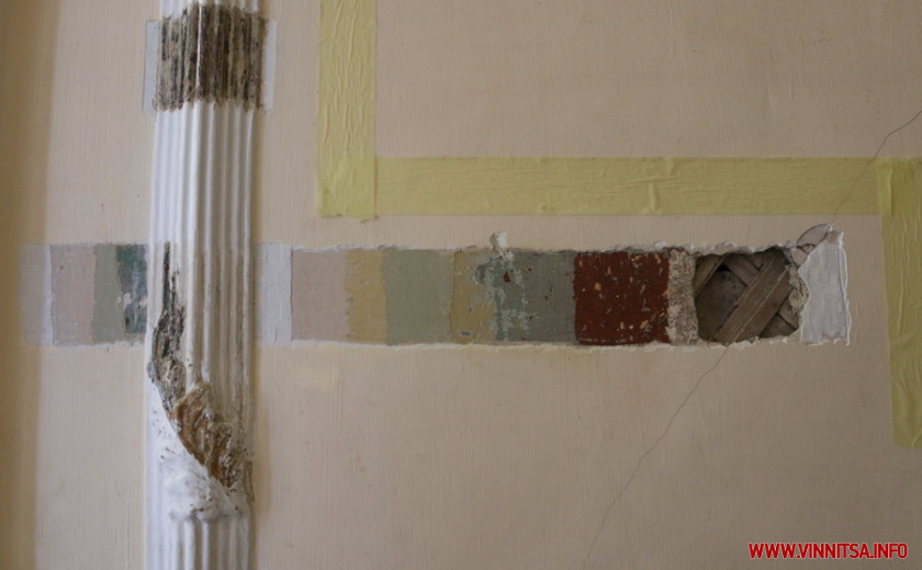 До речі, у коридорі під час розчисток верхніх шарів на стінах, виявили фрагменти збережених у будівлі оригінальних тиньків, які свідчать, що опорядження стін внутрішніх інтер’єрів було здійснено альфрейно-живописним методом. Це таке собі оздоблення приміщень з допомогою декоративного покриття або нанесення фактурної штукатурки.
