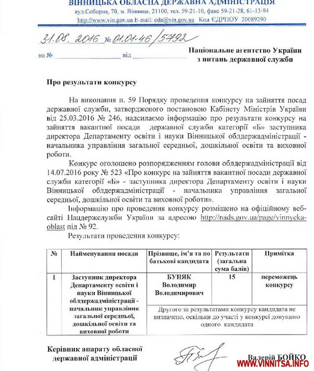 За результатами конкурсу на посаду заступника директора Департаменту освіти і науки Вінницької - начальника управління загальної, середньої дошкільної освіти та виховної роботи, переможцем визначений Володимир Буняк. Він набрав 15 балів у конкурсі.