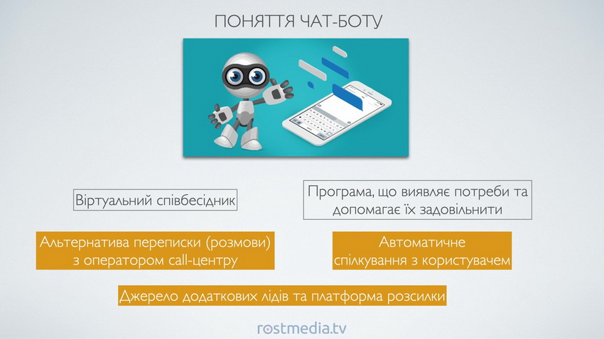 Чат-бот – це віртуальний співбесідник. Програма, що виявляє потреби та допомагає їх задовільнити. Дана програма може бути застосована як альтернатива переписки, або навіть живої розмови з оператором кол-центру, менеджера з продажів та інших напрямків, що потребують контакту з клієнтом. Також чат-бот допомагає покращувати KPI (показники ефективності) багатьох напрямків діяльності компанії.