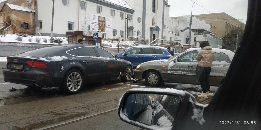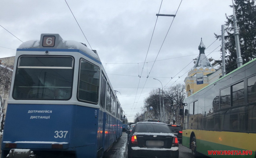 У Вінниці 31 січня близько 08.30 години на вулиці Соборна, навпроти костелу, сталась аварія за участі автомобілів «Ауді» та «Део». Два легковика зіштовхнулись на трамвайній колії і заблокували рух трамваїв.