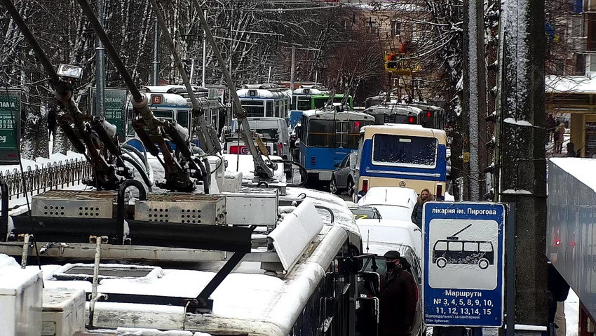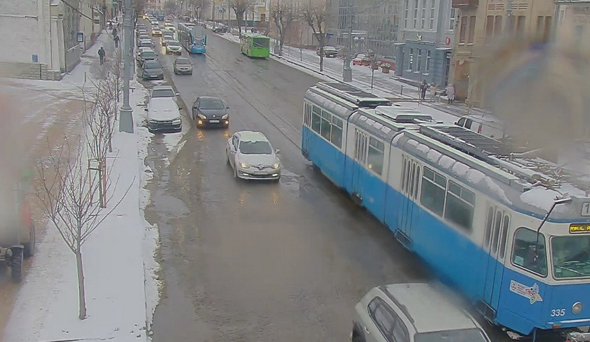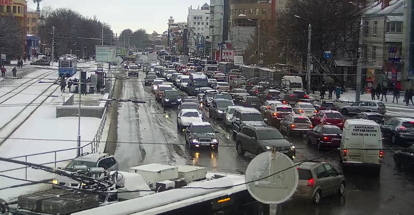 Станом на 09.50 трамваї на Сбороній стоять. А на вулиці Пирогова утворився затор. Фото камер Ситуаційного центру